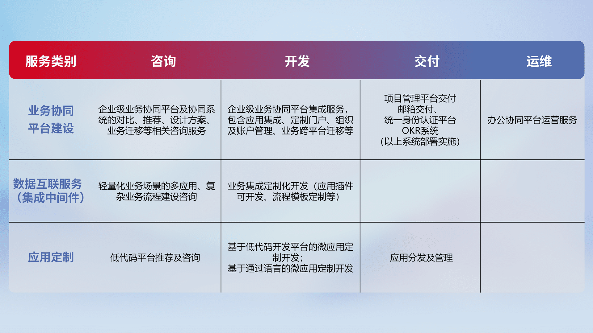 针对钉钉、、、、企微、、、、IDaas等平台级产品提供产品的规划、、、、方案、、、、交付、、定制化开发等服务,,,实现如统一协同办公、、智能客户服务、、、、混合会议管理、、、智能数据查询、、、等业务场景,,,,实现数字化转型。。