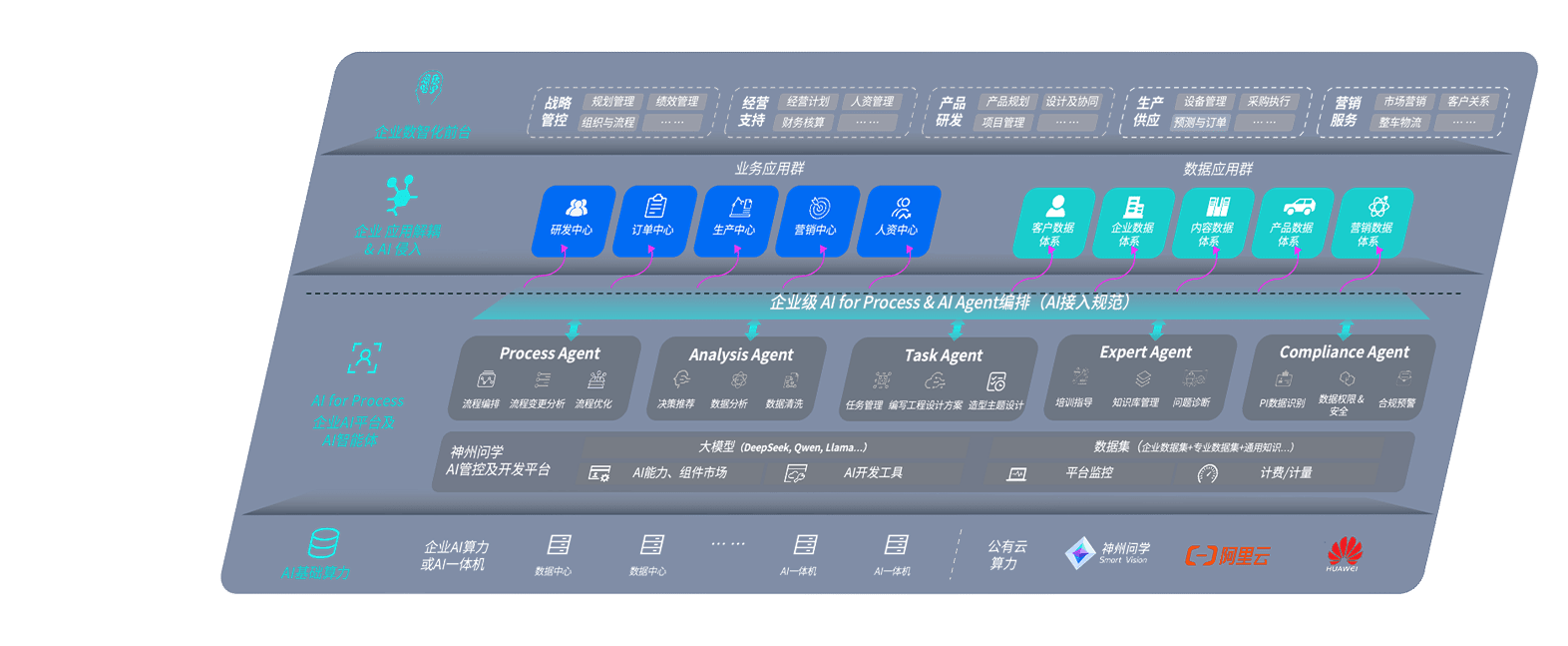 端到端的一站式AI工作空间深度融合了从企业战略规划到日常经营的全流程业务板块,,,,定向解决车企内部领域多、、部门多、、、链条长、、、场景碎片化等难题,,,,支持车企快速构建以AI为核心的生产力写作体系,,实现任务执行与AI能力的无缝集成与交互
